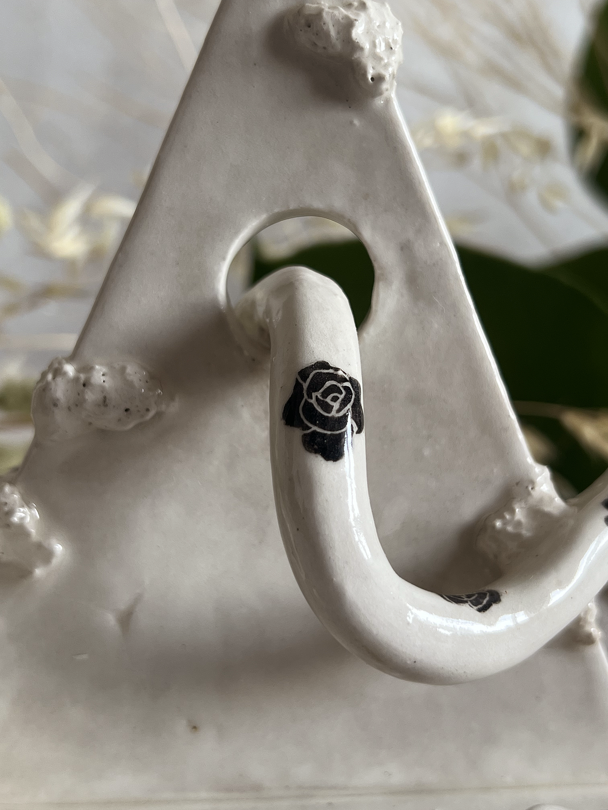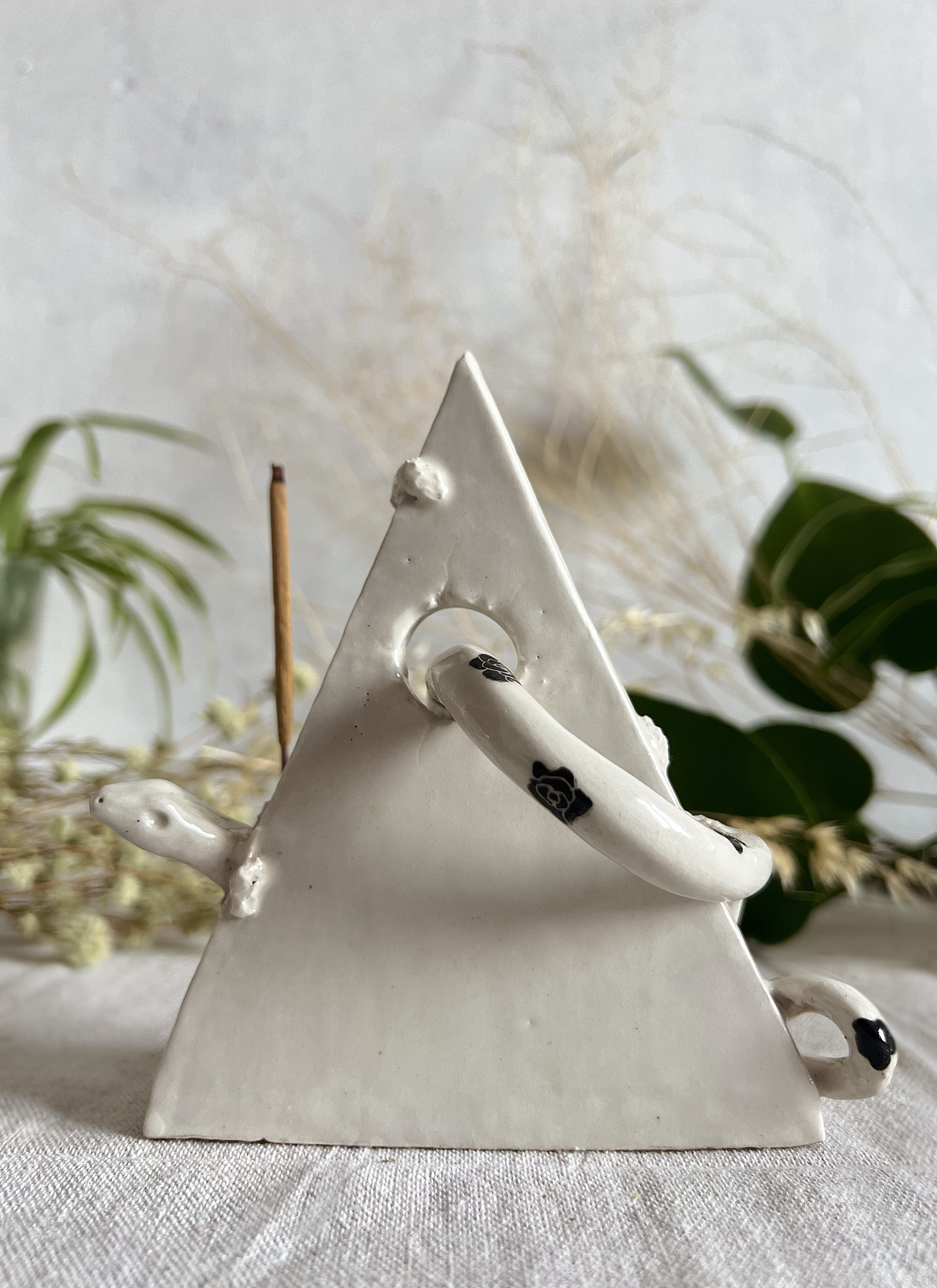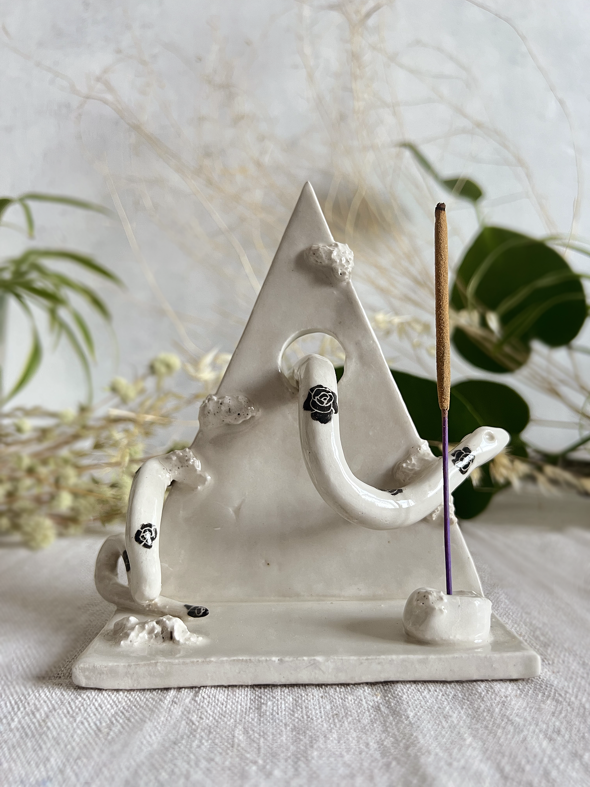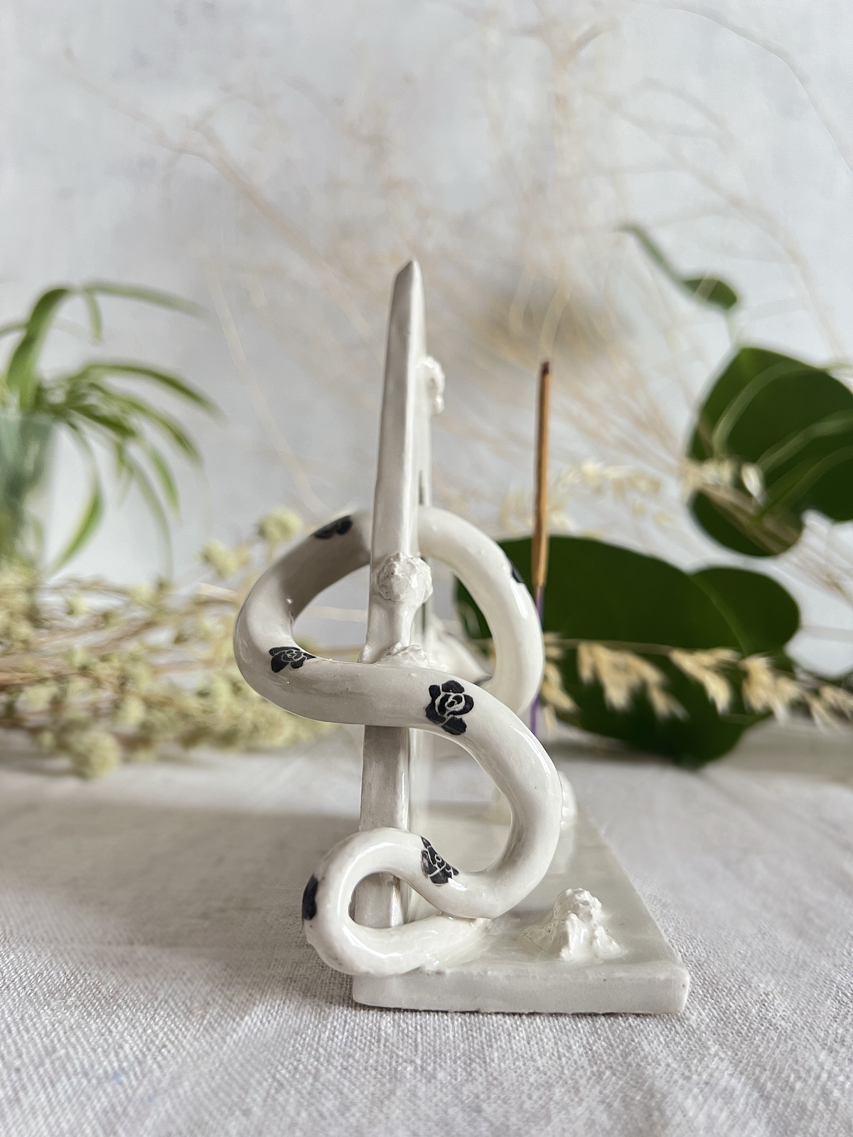 Una pieza de altar única, elaborada a mano en gres cocido a alta temperatura, con una elegante serpiente blanca enroscada con rosas negras, con detalles de vegetación y una pequeña piedra para colocar varitas de incienso.