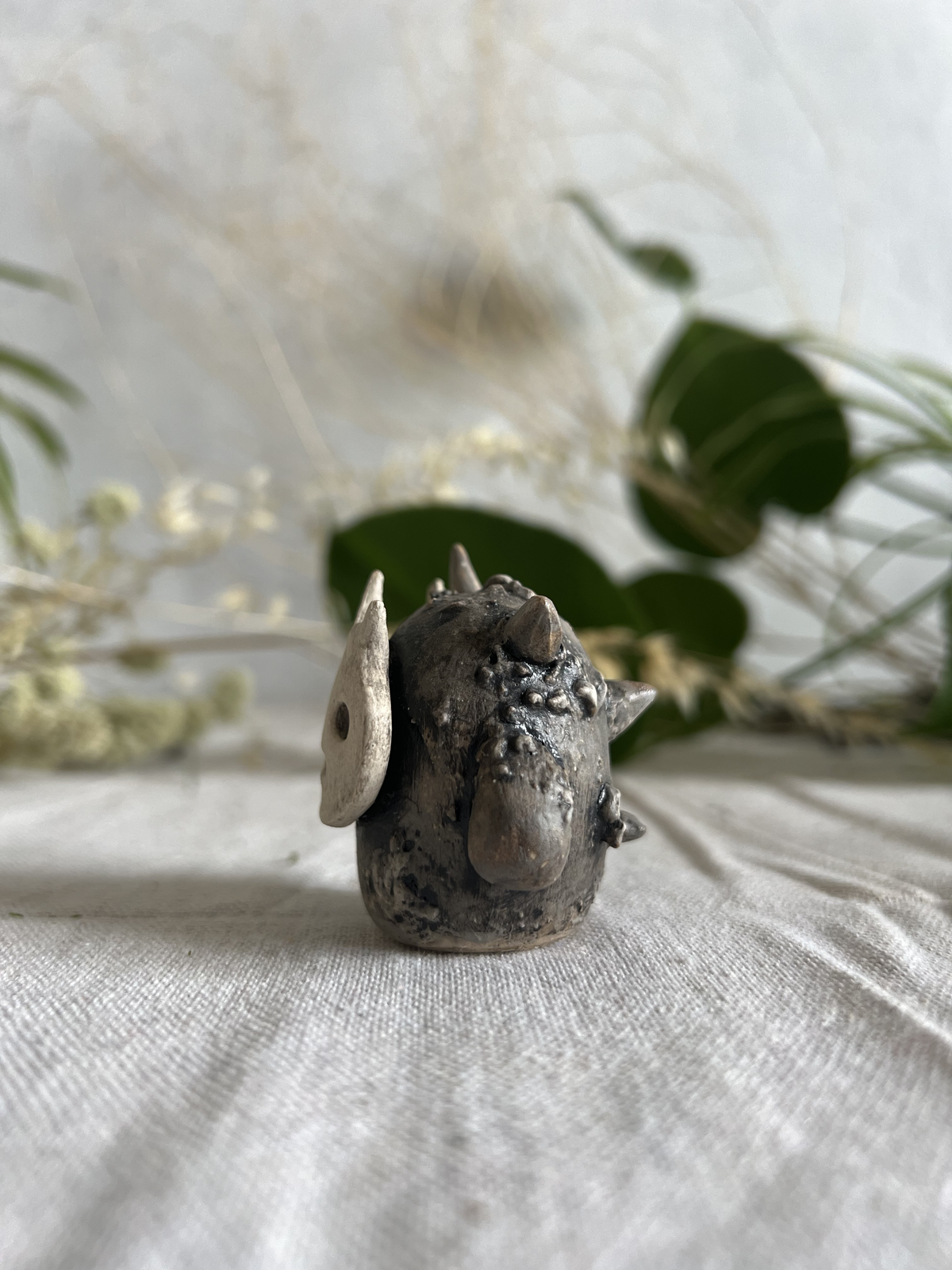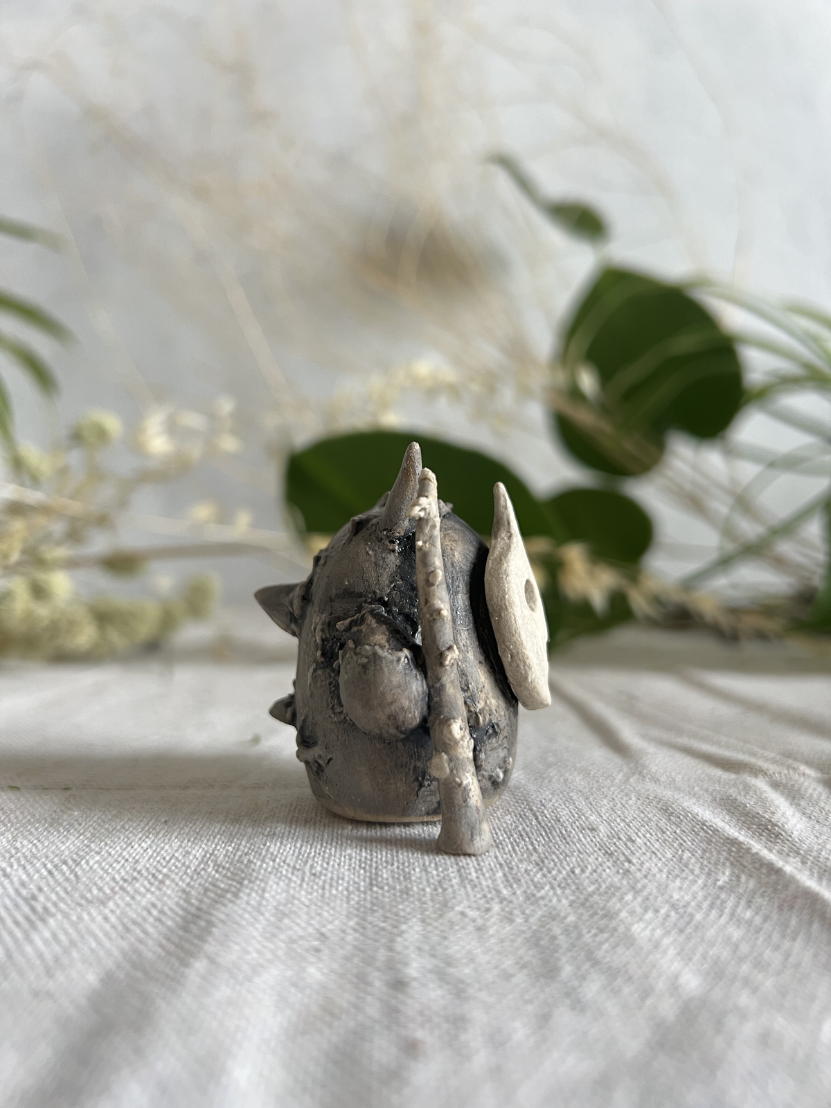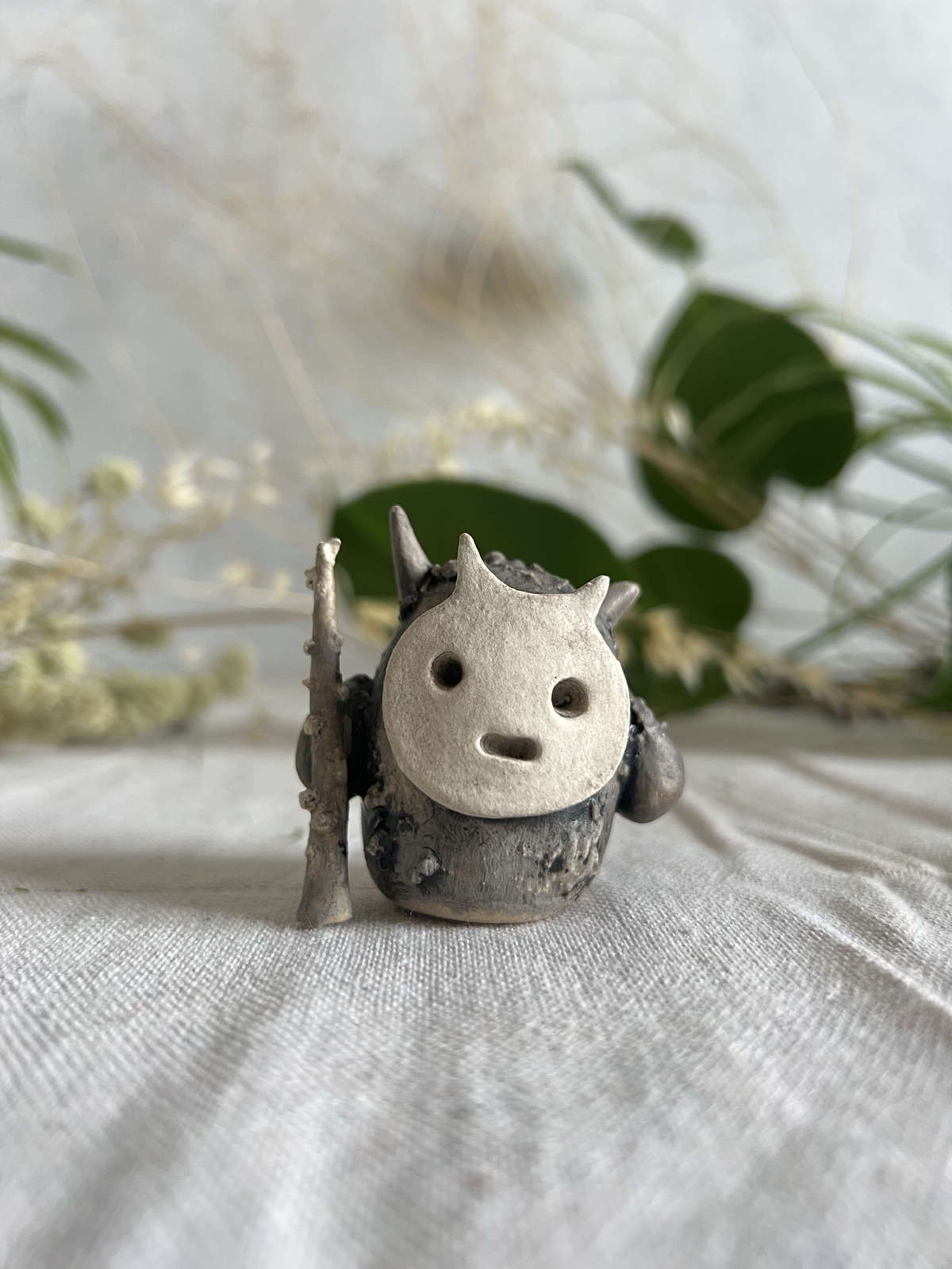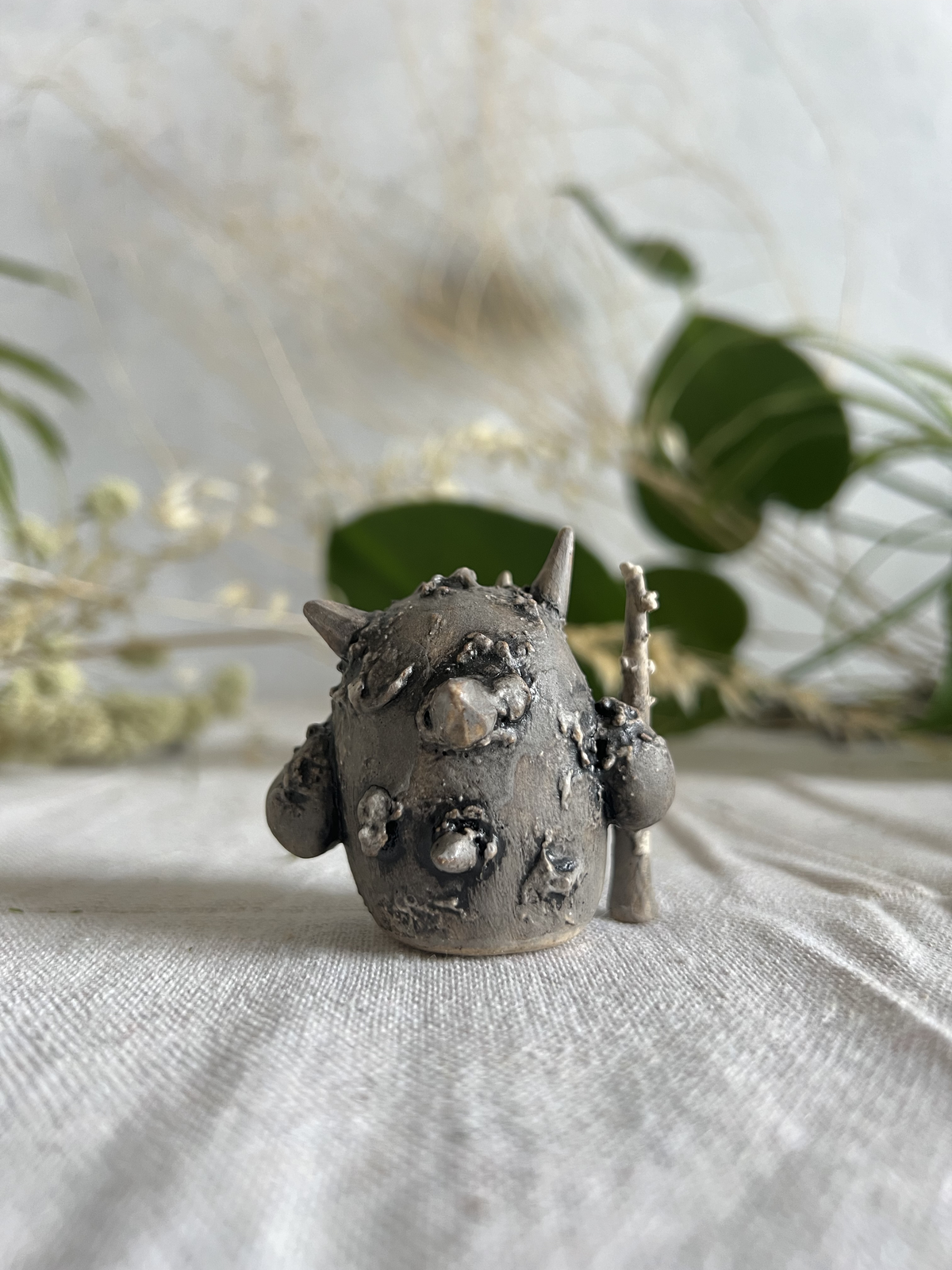 Escultura artesanal de un chamán volcánico, con cuerpo pétreo y detalles que evocan roca solidificada. Es un guardián que transmite la dureza y el poder de la tierra en movimiento.