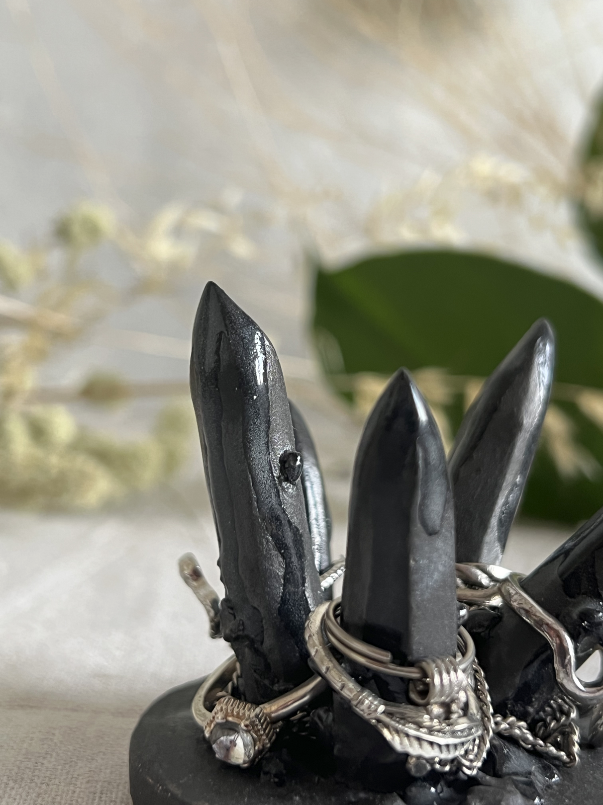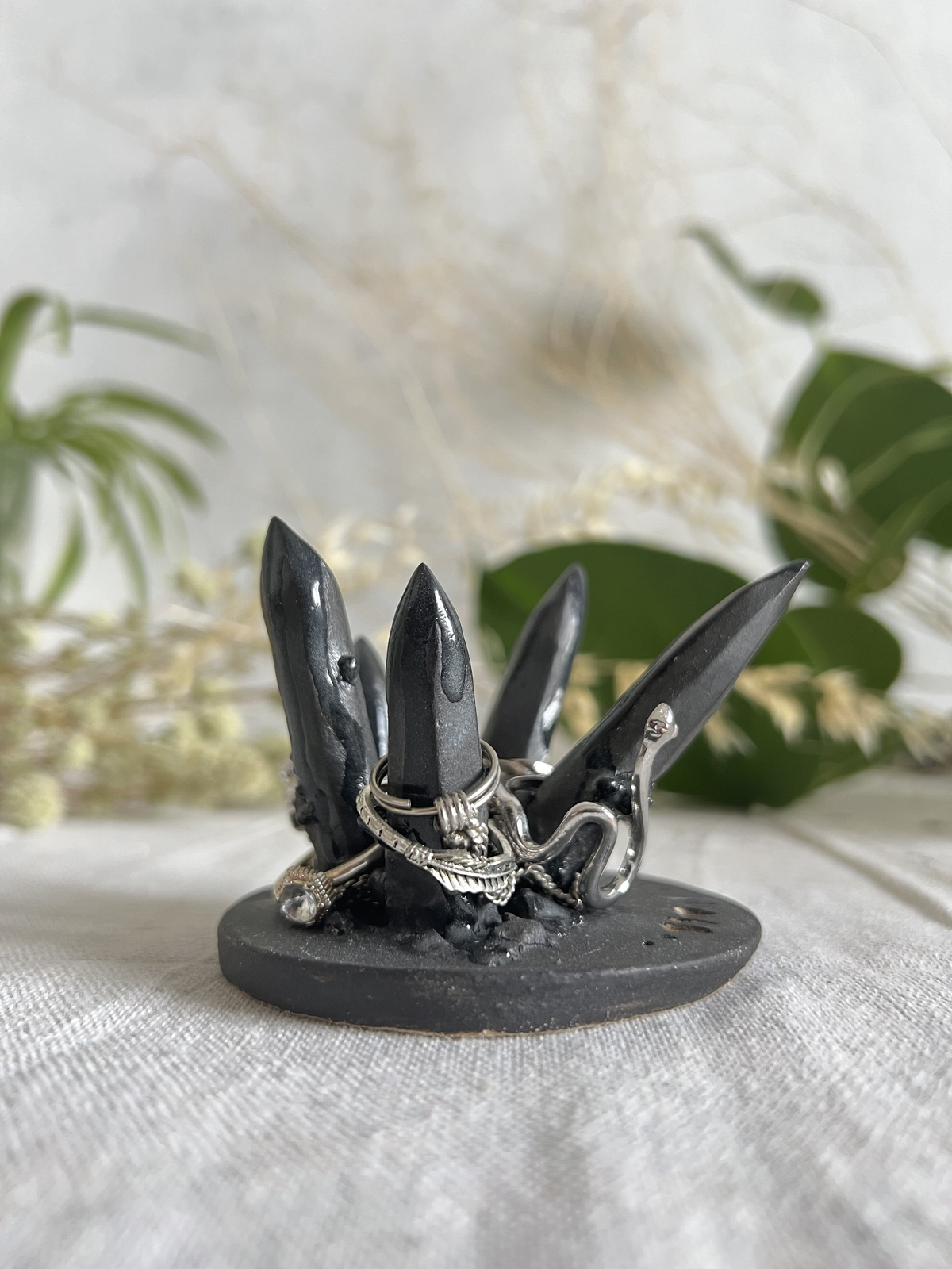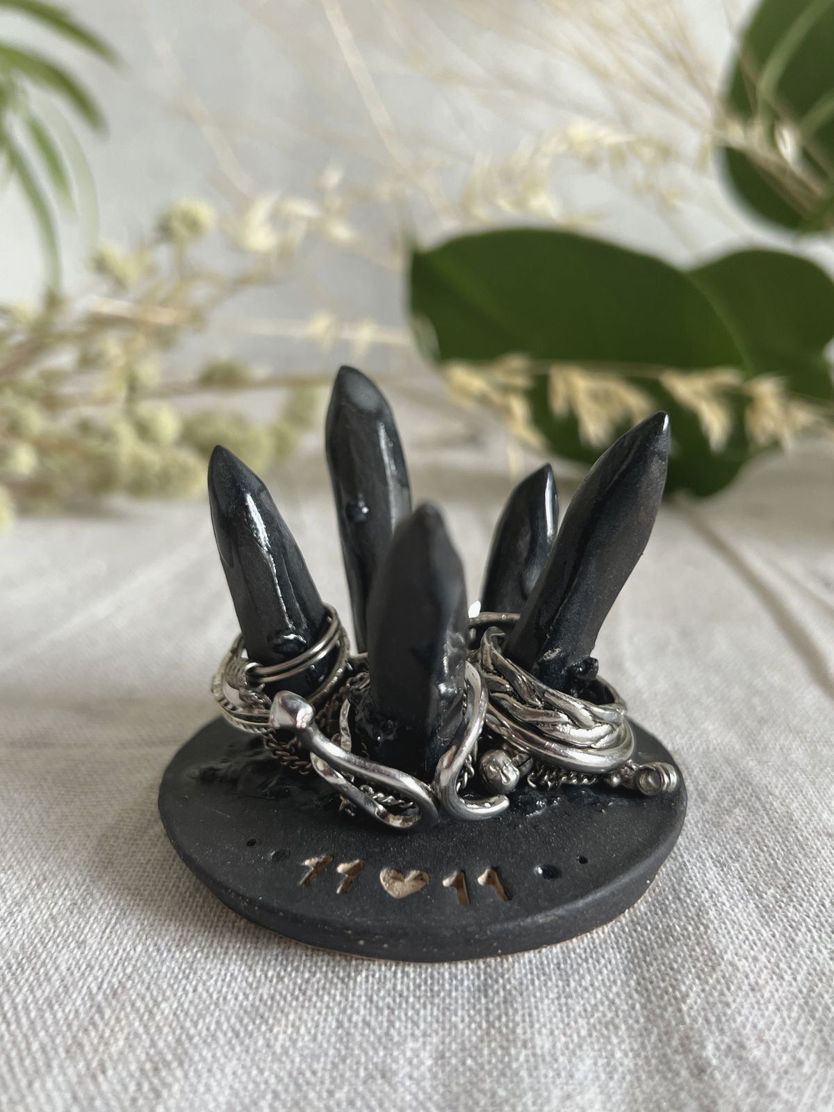 Porta anillos en gres de color negro con chorretones de esmalte transparente que caen desde los cristales hacia el centro.